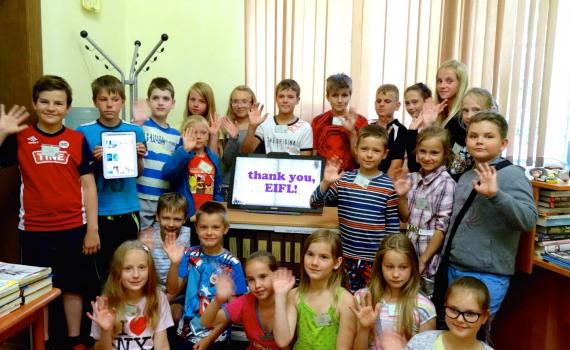 Children at Pelči Library (Latvia) celebrate the arrival of new equipment bought with the EIFL prize money - a touch screen computer monitor and a tablet e-book reader.