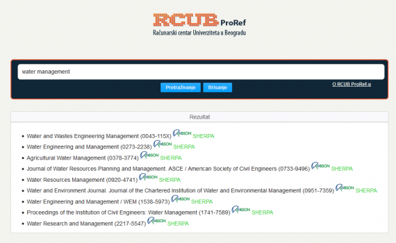 RCUB ProRef, which is publicly available, has a very simple interface and it may be searched by any term from the journal's title, ISSN and even an article's DOI. The results list shows journal titles meeting the search criteria accompanied with the links to the journals' self-archiving policies in SherpaRomeo and e-resources provided through the national library consortium Kobson (access to these e-resources is not publicly available).