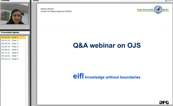 The Q&A webinar OJS begins with a presentation from Bozana Bokan (Center for Digital Systems (CeDiS): Open Access/e-Publishing, Freie Universität Berlin) providing an overview of the OJS software functions and focusing on recent and new features.